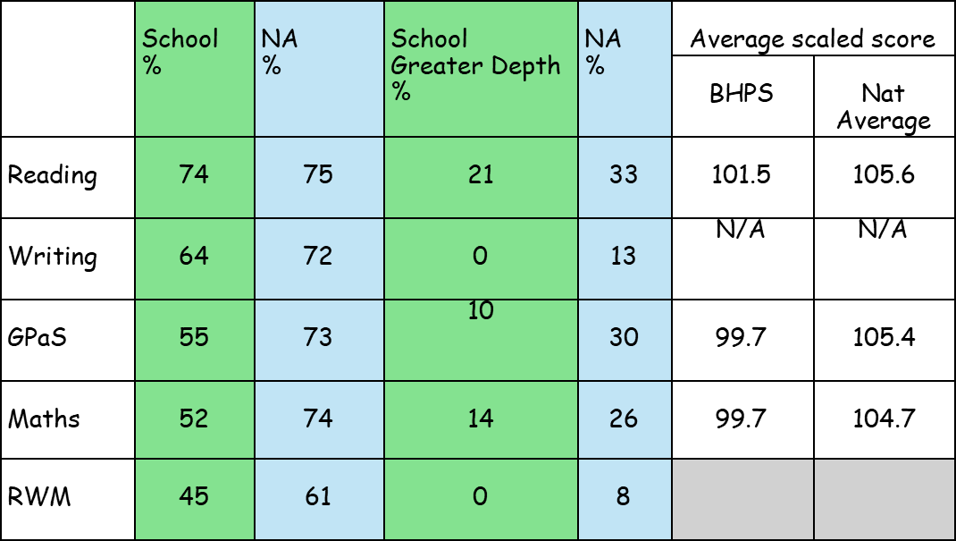 SATS (Standard Assessment Tests) tests are given at the end of Year 6 in Reading, Maths and Grammar, Spelling and Punctuation (GPS). They are used to show your child’s progress compared with other children across the country. The expected scaled score for children is 100. Any child that has a scaled score of 110 or greater is judged to have greater depth in that subject.